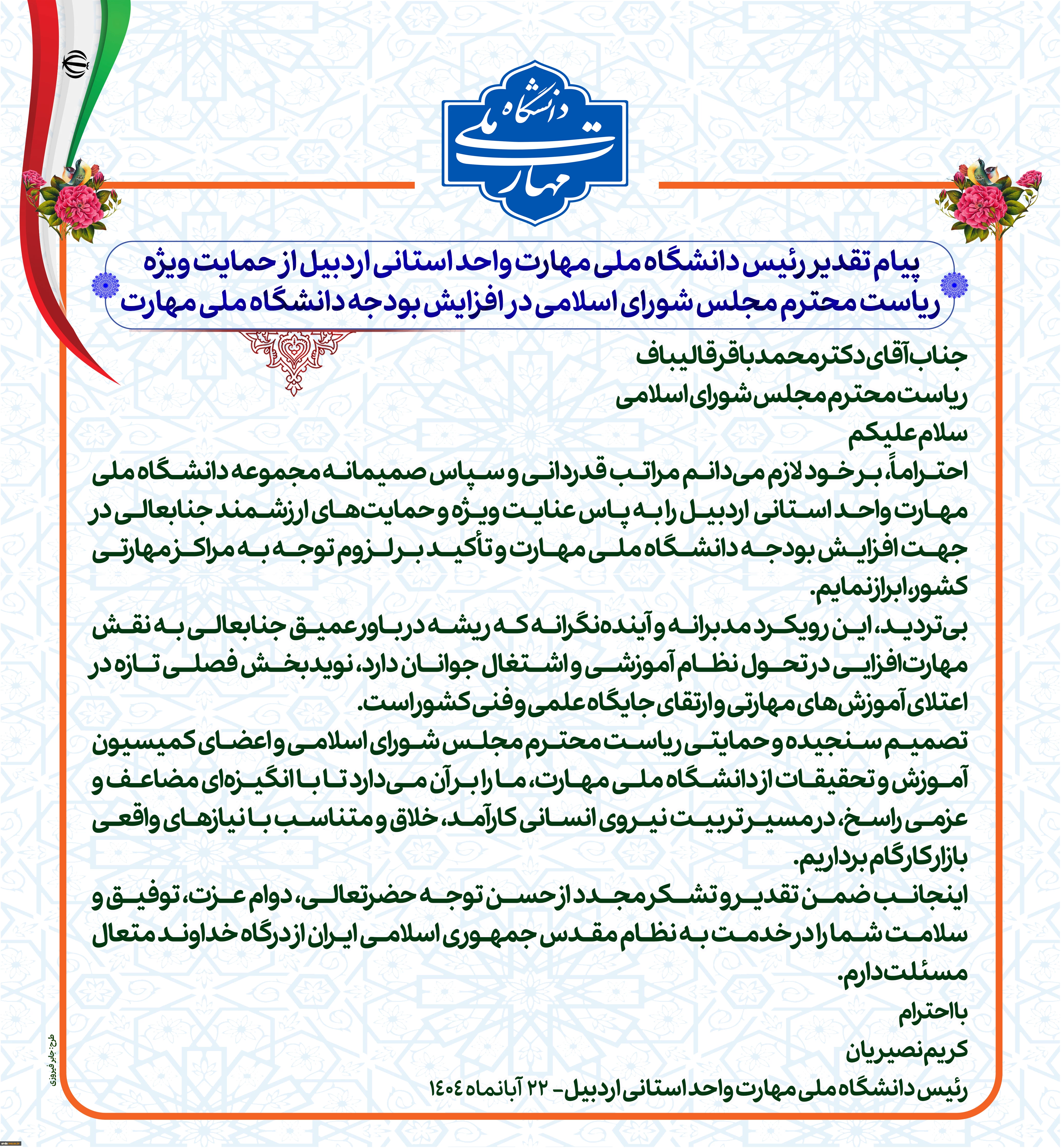 امتیاز دهید : پیام تقدیر رئیس دانشگاه ملی مهارت واحد استانی اردبیل از حمایت ویژه ریاست محترم مجلس شورای اسلامی در افزایش بودجه دانشگاه ملی مهارت 2 پنجشنبه 22 آبان 1404 ساعت 10:25